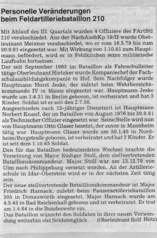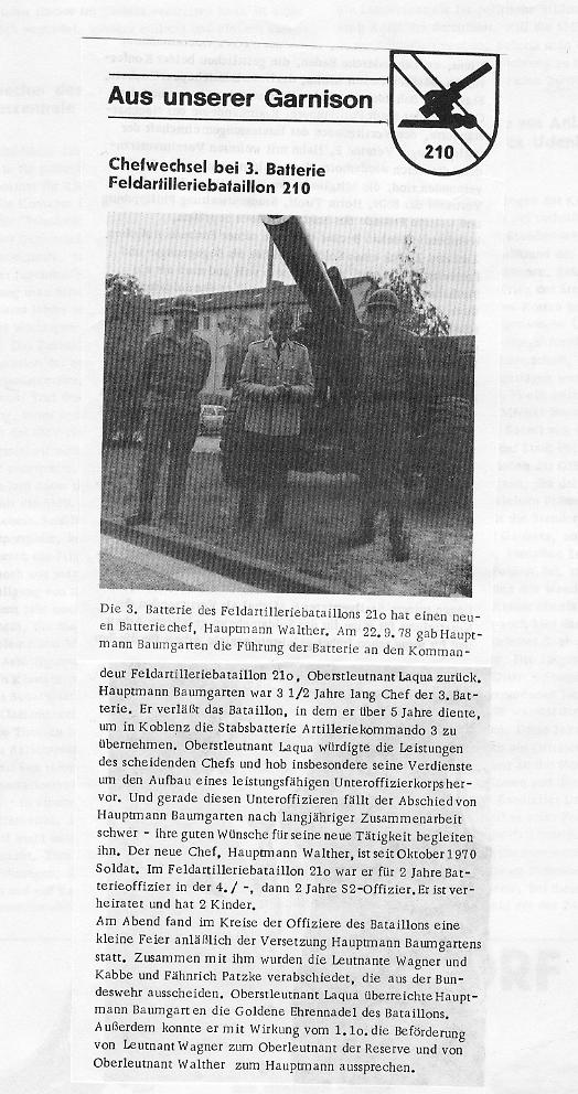 Seit dem 29. Dezember 1980 hat die 3./FArtBtl 210 einen neuen Batteriechef. Vor der angetretenen Batterie nahm der Kommandeur des Feldartilleriebataillons 210, Oberstleutnant Laqua, das Kommando über die 3. Batterie von Hauptmann Walther zurück. In einer kurzen Ansprache würdigte der Kommandeur die besonderen Leistungen Walthers, der es in seiner über zweijährigen Dienstzeit als Chef der 3. Batterie verstanden hat, die Batterie zu einem sehr guten Ausbildungsstand zu führen. Hauptmann Walther beginnt nun seine Berufsausbildung und steht der aktiven Truppe in seinen letzten 1 1/2 Jahren als Soldat nicht mehr zur Verfügung. Anschließend übergab Oberstleutnant Laqua das Kommando an Oberleutnant Weisenburger, der seit Oktober 1973 Soldat und seither Angehöriger des Feldartilleriebataillons 210 ist. Oberleutnant Weisen- burger ist Berufsoffizier und war vor seiner jetzigen Tätigkeit der S2 Offizier des Bataillons.